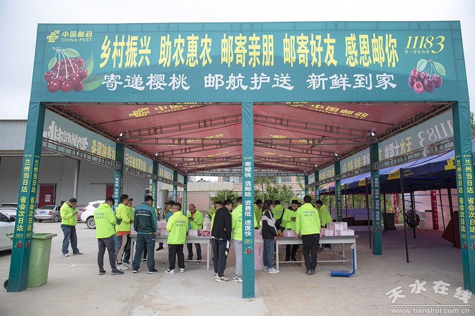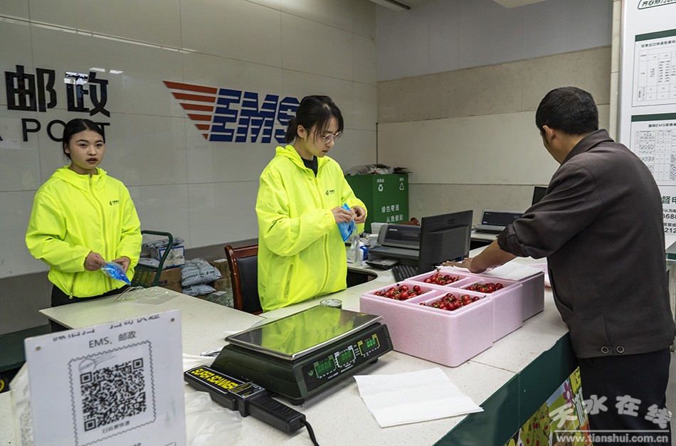 在中國郵政天水分公司廣場營業(yè)所門口建立的臨時櫻桃交易市場里,一筐筐色澤艷麗、個大味美的大櫻桃整齊擺放。前來選購大櫻桃的顧客無需周折,就可以把新鮮的大櫻桃在隔壁的郵政營業(yè)所發(fā)往目的地。
