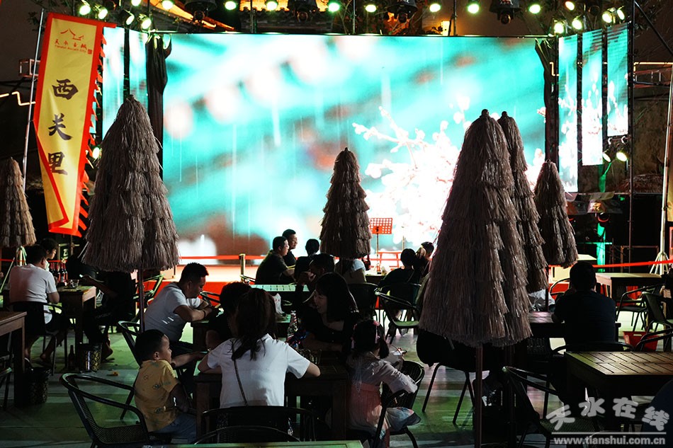 夜幕降臨,天水古城華燈初上,人流如潮,這里的夜市異常熱鬧。酒吧、特色燒烤、啤酒攤成為年輕一族最青睞的夜間消費業(yè)態(tài)。古城內開啟的網絡直播,吸引眾多市民駐足觀看。