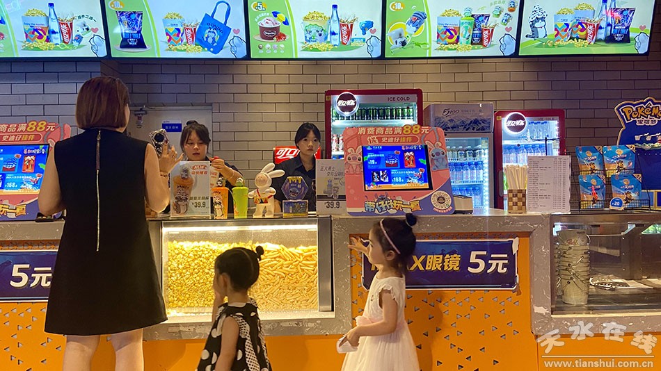 記者在秦州區(qū)多家影院看到,大廳內(nèi)人頭攢動(dòng),熱鬧非凡。影院門口、過道兩旁擺滿了暑期檔新影片宣傳海報(bào),電子大屏上循環(huán)播放著預(yù)告片。