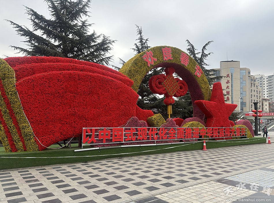 在龍城廣場(chǎng),以“歡度春節(jié)”為主題的綠雕景觀高達(dá)12米,占地面積近500平方米。恢宏大氣的中國(guó)傳統(tǒng)“中國(guó)結(jié)”,讓人眼前一亮,成了新晉過(guò)年賞花“打卡點(diǎn)”。紅旗、五角星、祥云等元素“簇?fù)怼毕,燈籠、燈帶等吉祥如意的新年元素一一呈現(xiàn),將我市的傳統(tǒng)文化與全新技術(shù)手段完美融合,傳達(dá)了秦州人民對(duì)美好生活的向往。