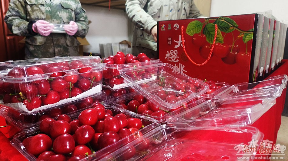 走進煙鋪村天水紅櫻桃農(nóng)業(yè)發(fā)展有限公司櫻桃大棚內(nèi),一串串晶瑩剔透、色澤紅潤的大櫻桃像紅燈籠一樣掛滿枝頭。工作人員正忙著采摘裝箱。記者了解到,從2月1日起,該公司種植的大棚櫻桃已開始陸續(xù)采摘,并通過電商平臺銷往全國各地。