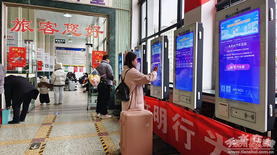 “在網(wǎng)上也可以隨時購票,如果客流量多的話,我們隨時做好準備,調(diào)加班車,窗口工作人員隨時增加,每一個安檢口都有把關。如果遇到極端天氣,我們隨時看天氣,如果發(fā)不了車就隨時停班,我們會給乘客耐心解釋,給他們?nèi)~退款。同時,我們的母嬰室、候車室的座位,飲用水都有,一套服務全部都有!碧旒渭瘓F交運運輸公司天水汽車站調(diào)度班長張紅霞說。