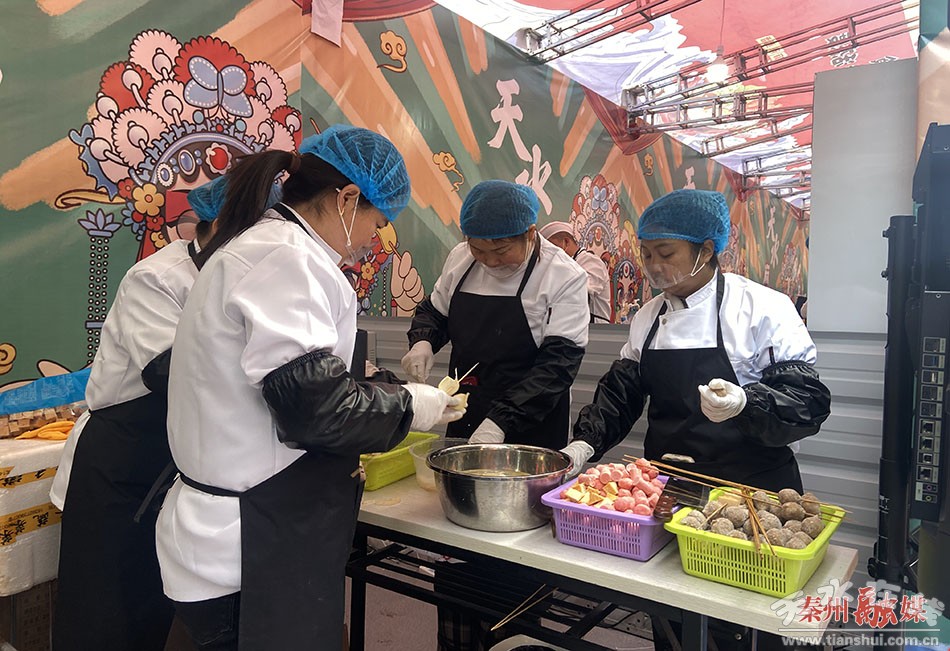 上午十一點,在新打造的天水麻辣燙一條街上,桌椅整齊擺放,天水麻辣燙的經(jīng)營戶們火力全開,嫻熟地串菜、燙粉、煮菜、拌料,用地道的手法,做正宗的天水麻辣燙,熱情接待八方賓朋。