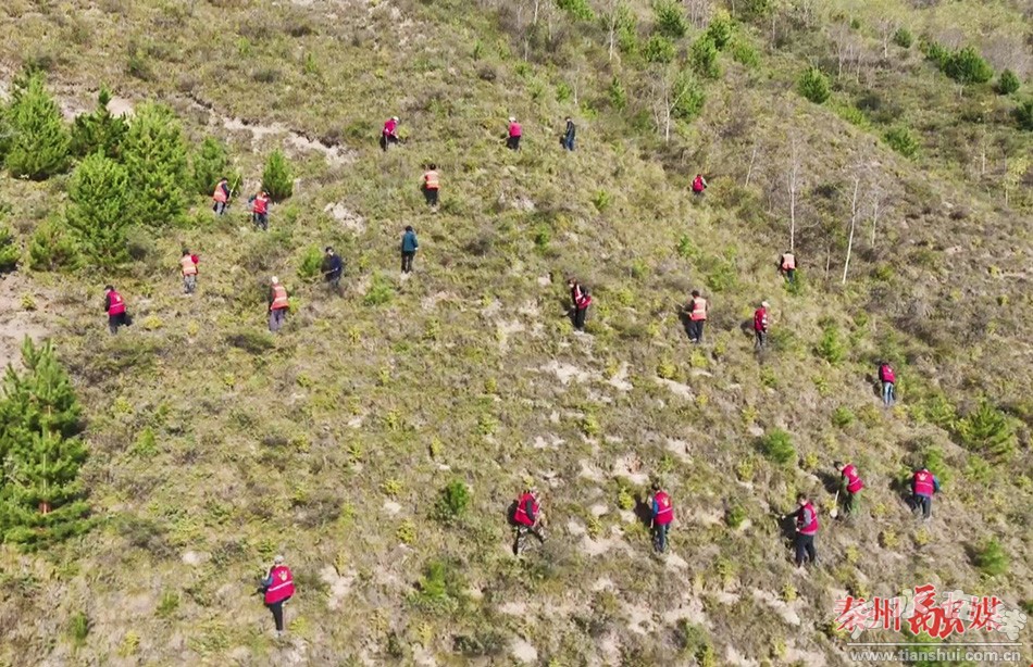 在秦州區(qū)西城區(qū)北山面山綠化工程作業(yè)現(xiàn)場,無人機在工作人員的操作下,將一棵棵苗木騰空吊起,送至山頂?shù)脑灾颤c,再由造林工人進行栽植。