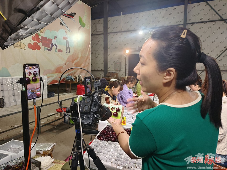在藉口鎮(zhèn)四十鋪村果品交易市場的兩家冷庫企業(yè),記者看到,電商直播正在進(jìn)行。主播在手機(jī)前推廣接單,后面工作人員忙著分揀、打包。這種現(xiàn)場挑選、現(xiàn)場展示、現(xiàn)場發(fā)貨的直播方式,讓秦州大櫻桃線上銷售訂單不斷,持續(xù)火爆。