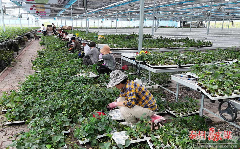 在天水鎮(zhèn)草莓小鎮(zhèn)的草莓育苗棚里,記者看到,綠油油的草莓苗在陽(yáng)光下格外奪目,50多位工人正在運(yùn)苗、剪葉、打包、裝車,大家分工明確,井然有序。