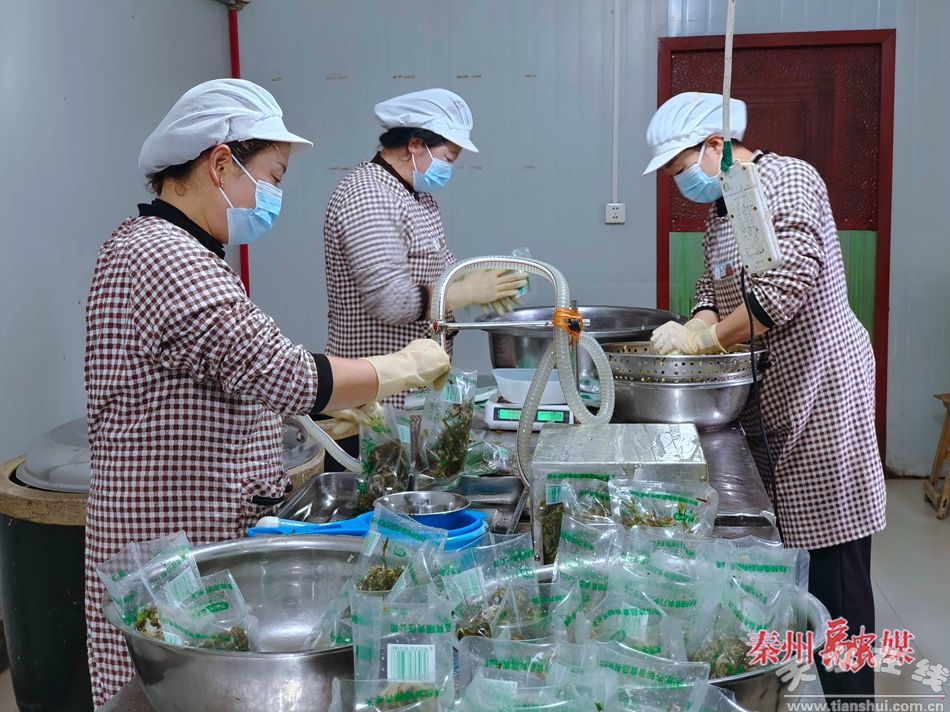 在齊明香酸菜廠的加工廠房內(nèi),工人們正在有序地包裝酸菜、稱重、注入漿水……一系列操作后,一件件帶有“齊明香”商標的酸菜加工完成,“整件待發(fā)”。另一邊,整齊排列著一排排自然發(fā)酵的漿水大缸,工人們通過不斷攪拌,使其充分發(fā)酵。她們一邊忙碌一邊向記者介紹著這份家門口的工作。