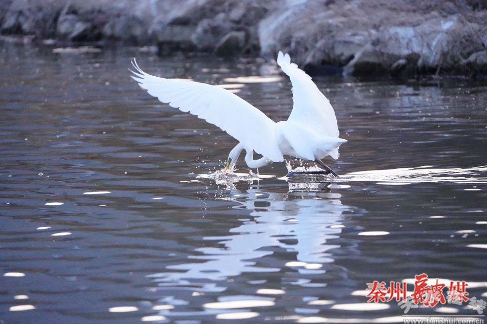 暖陽(yáng)下的藉河,水波蕩漾,成群候鳥或在水中悠然游弋,或在淺灘梳理羽翼,或盤旋天際劃出優(yōu)美弧線。潔白的白鷺踮著修長(zhǎng)細(xì)腿,低頭捕食時(shí)濺起朵朵水花;國(guó)家二級(jí)保護(hù)動(dòng)物灰鶴昂首闊步,神情悠然自得;機(jī)靈的綠頭鴨結(jié)伴穿梭,水面泛起層層漣漪。偶爾有攝影愛(ài)好者舉著“長(zhǎng)槍短炮”,在親水平臺(tái)悄悄記錄下這靈動(dòng)瞬間,生怕驚擾這些冬日“來(lái)客”。