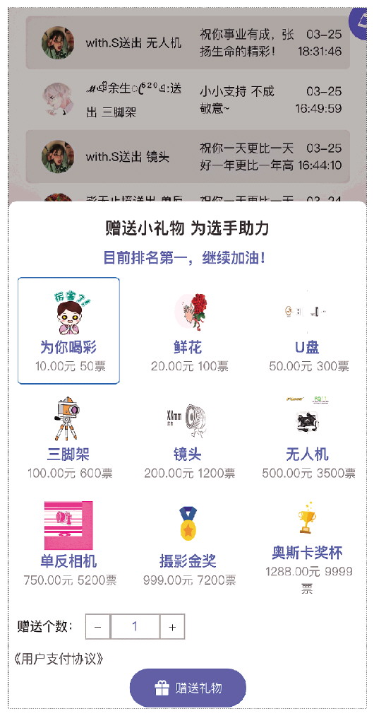 網(wǎng)友可購(gòu)買禮物幫助參賽選手漲票。