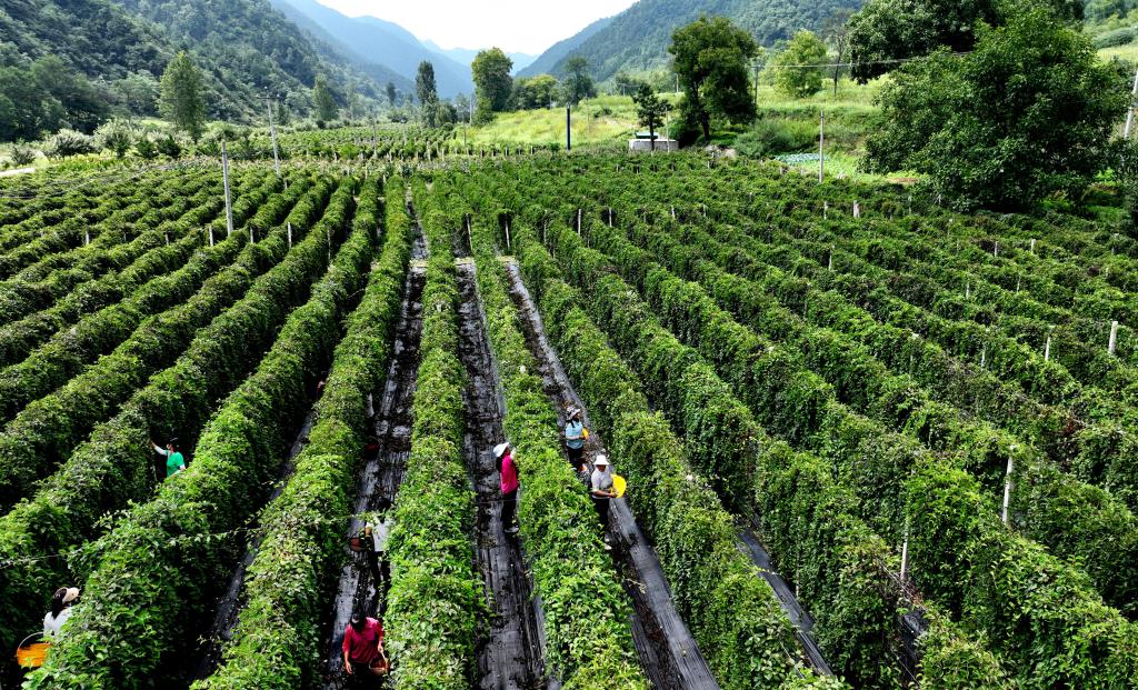 2022年8月21日,陜西省洛南縣煜正中藥材專(zhuān)業(yè)合作社的員工在田間采摘五味子(無(wú)人機(jī)照片)。新華社記者陶明攝