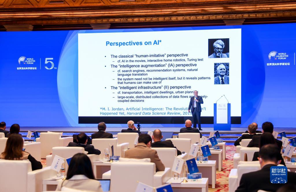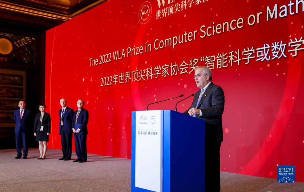 11月6日,2022年世界頂尖科學(xué)家協(xié)會(huì)獎(jiǎng)“智能科學(xué)或數(shù)學(xué)獎(jiǎng)”得主、美國(guó)計(jì)算機(jī)科學(xué)與統(tǒng)計(jì)學(xué)家邁克爾·I·喬丹(右一)在頒獎(jiǎng)典禮上致辭。新華社發(fā)