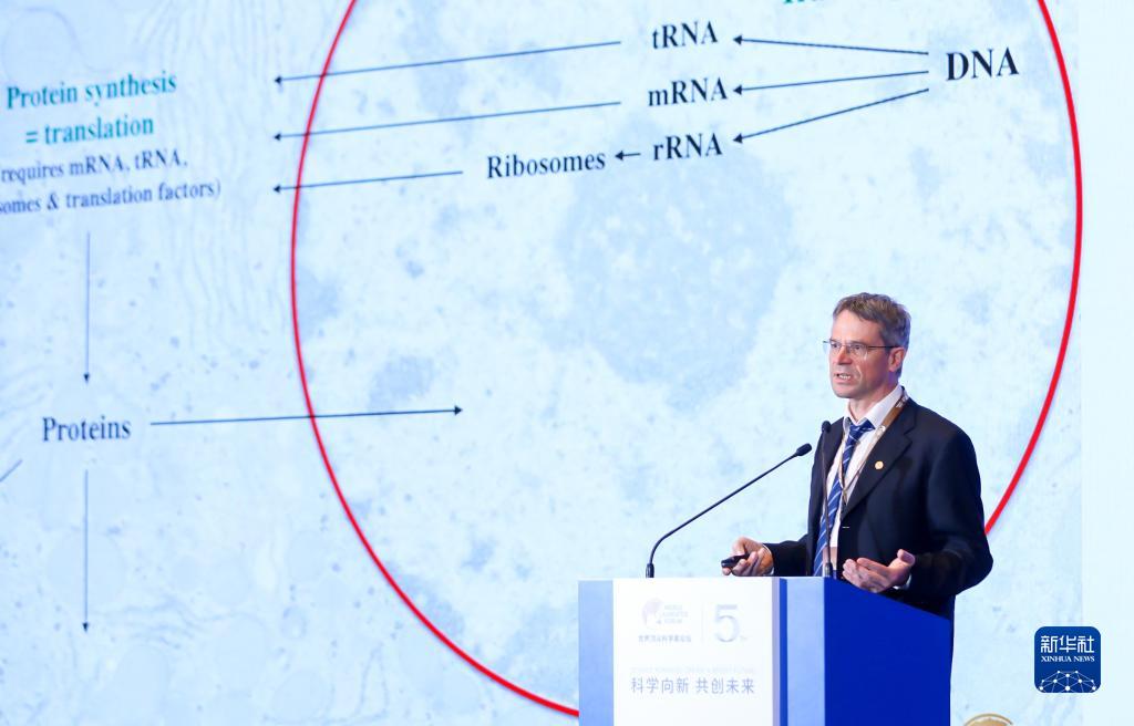 11月6日,2022年世界頂尖科學(xué)家協(xié)會(huì)獎(jiǎng)“生命科學(xué)或醫(yī)學(xué)獎(jiǎng)”得主、德國(guó)生物化學(xué)家迪爾克·格爾利希在開(kāi)幕式上發(fā)表演講。新華社發(fā)