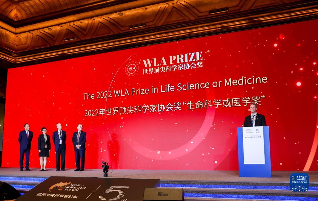 11月6日,2022年世界頂尖科學(xué)家協(xié)會(huì)獎(jiǎng)“生命科學(xué)或醫(yī)學(xué)獎(jiǎng)”得主、德國(guó)生物化學(xué)家迪爾克·格爾利希(右一)在頒獎(jiǎng)典禮上致辭。新華社發(fā)