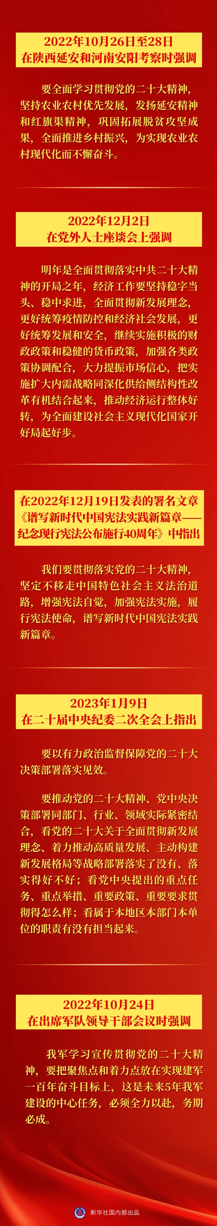 一分部署,九分落實(shí)。黨的二十大以來,針對各項(xiàng)具體工作,習(xí)近平總書記在多個(gè)場合就學(xué)習(xí)貫徹黨的二十大精神提出要求——
