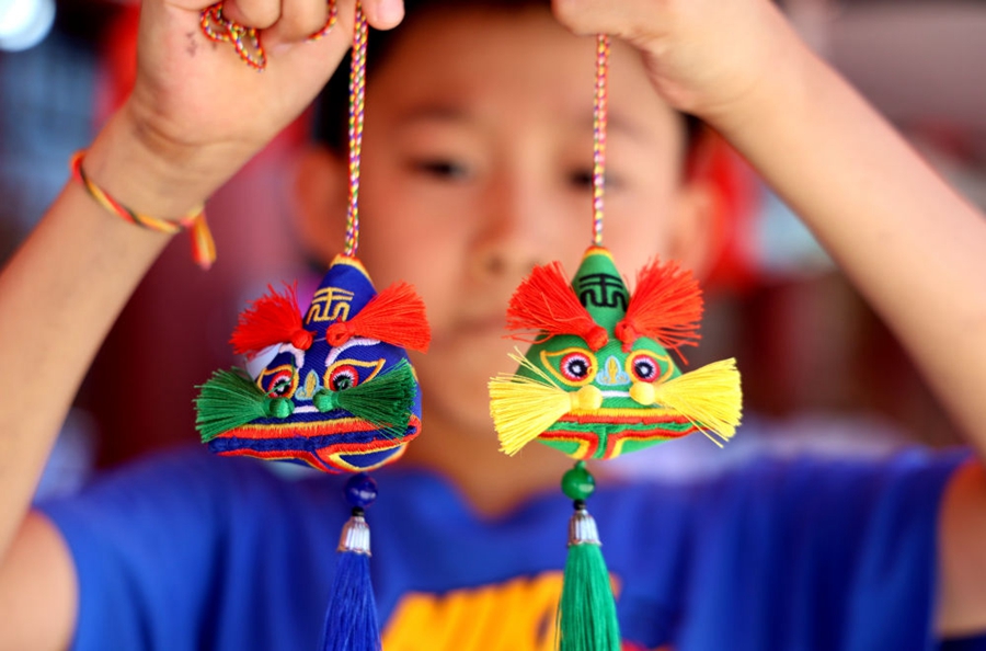 6月22日,在山東省濱州市無棣縣古城風景區(qū),小朋友展示選購的香囊。新華社發(fā)(初寶瑞 攝)