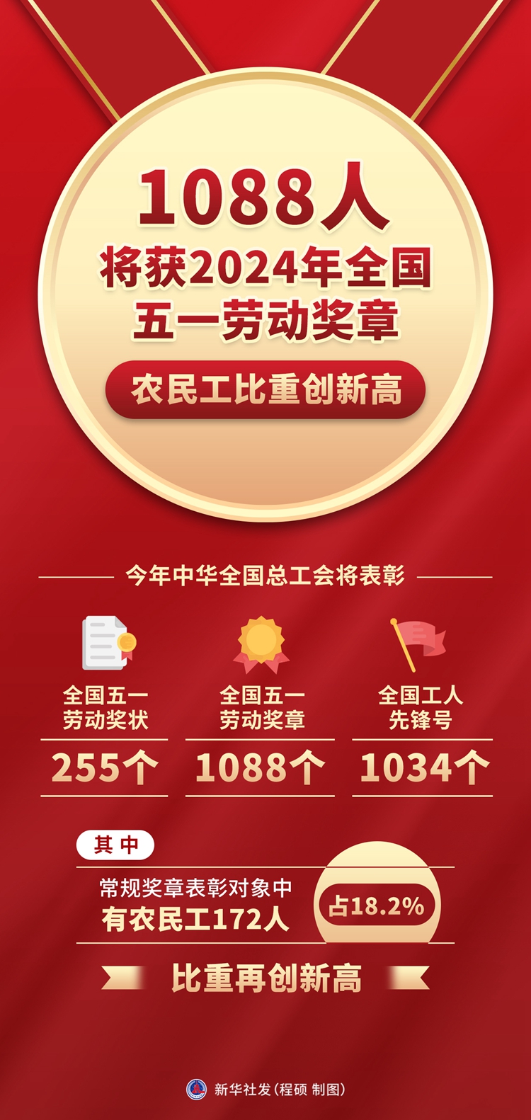 新華社北京4月27日電(記者樊曦、黃垚)“五一”國(guó)際勞動(dòng)節(jié)即將到來(lái)。記者27日從中華全國(guó)總工會(huì)獲悉,今年全總將表彰全國(guó)五一勞動(dòng)獎(jiǎng)狀255個(gè)、全國(guó)五一勞動(dòng)獎(jiǎng)?wù)?088個(gè)、全國(guó)工人先鋒號(hào)1034個(gè)。其中,常規(guī)獎(jiǎng)?wù)卤碚脤?duì)象中有農(nóng)民工172人,占18.2%,比重再創(chuàng)新高。