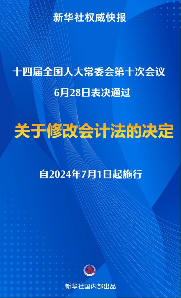 會(huì)計(jì)法是規(guī)范會(huì)計(jì)工作的基礎(chǔ)性法律。6月28日,十四屆全國(guó)人大常委會(huì)第十次會(huì)議表決通過(guò)關(guān)于修改會(huì)計(jì)法的決定,自2024年7月1日起施行。