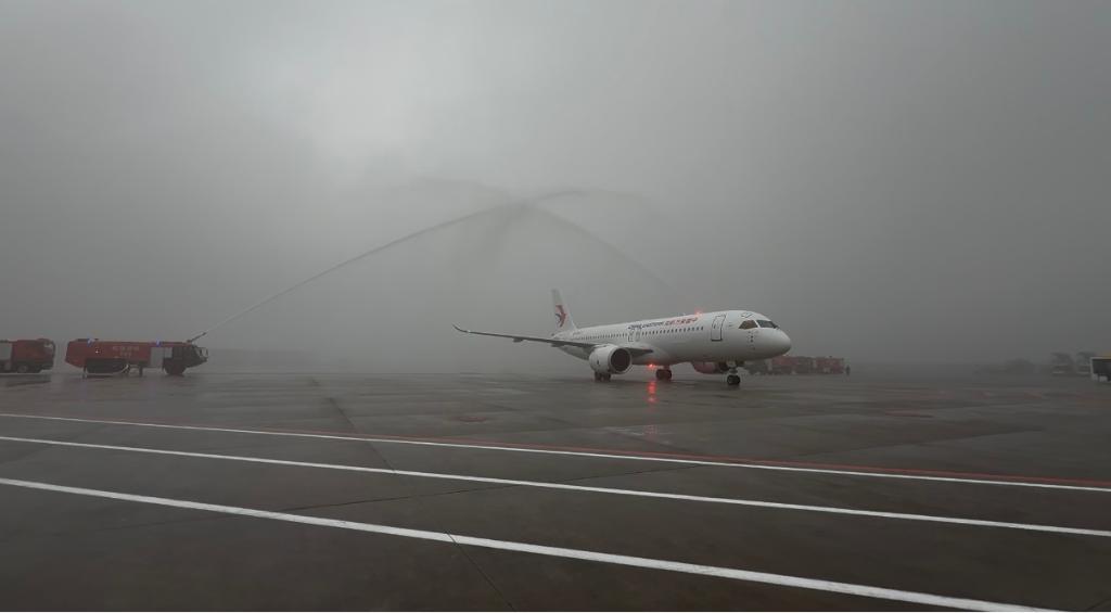 國(guó)產(chǎn)大飛機(jī)C919在重慶江北國(guó)際機(jī)場(chǎng)通過(guò)水門(mén)。新華社記者 趙佳樂(lè) 攝