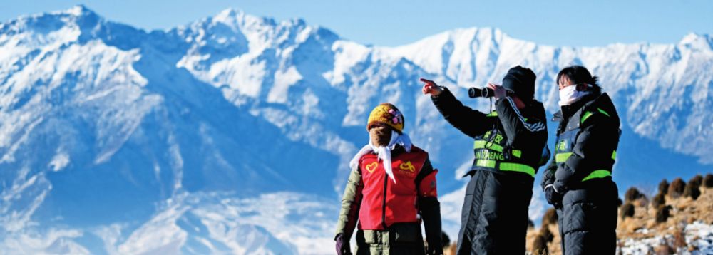 青海門源縣境內(nèi)的祁連山國家公園老虎溝管護站的生態(tài)管護員在巡護祁連山(2025年1月28日攝)。張龍攝/本刊