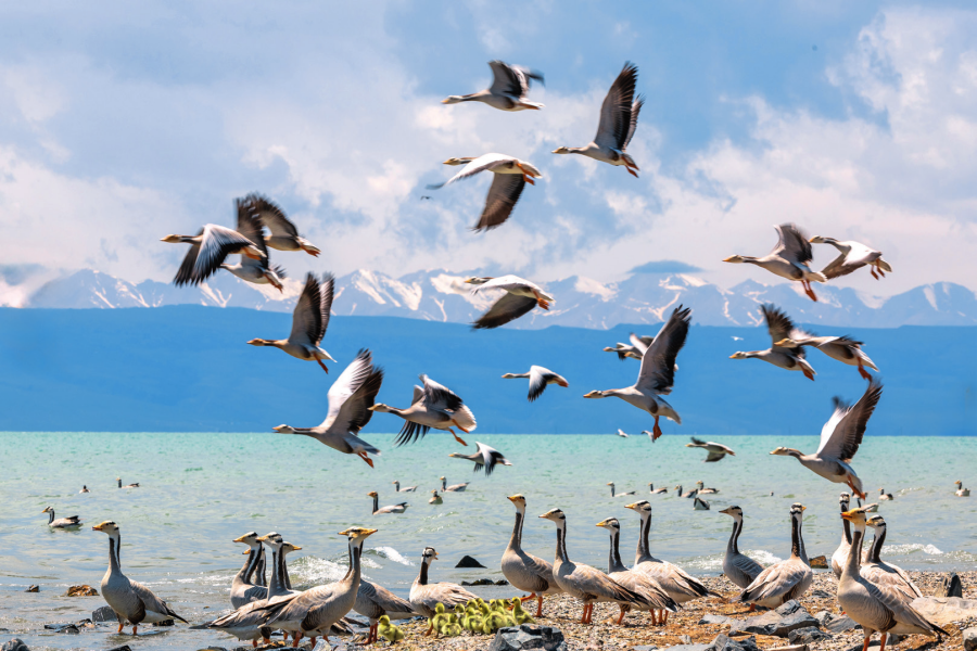 湖中,半河清水半河魚;水上,北歸候鳥翩躚嬉戲;岸邊,普氏原羚撒歡騰躍……青海湖的裸鯉資源蘊藏量達12.75萬噸,普氏原羚數(shù)量達3400余只,棲息水鳥數(shù)量達60.6萬只。近年來,荒漠貓、白唇鹿等珍稀物種重新回歸視野,過去難得一見的黑頸鶴、黑鸛、大天鵝等頻頻亮相。萬物并育,吟唱蓬勃的生命之歌。