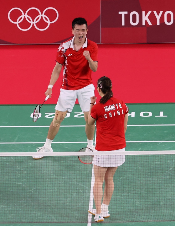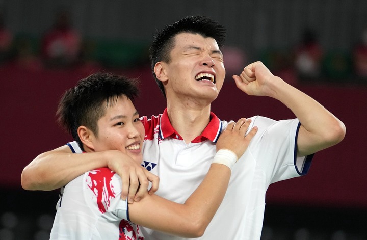 7月30日,王懿律(右)/黃東萍慶祝奪冠。新華社記者 李一博 攝
