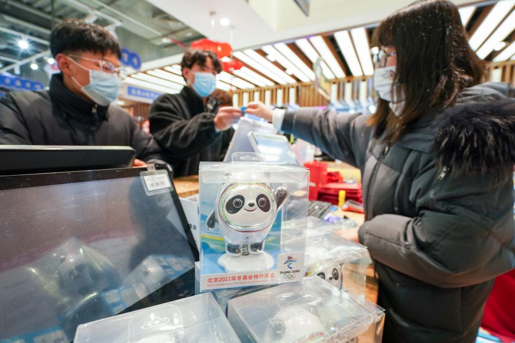 2月10日,市民在江蘇南京一處北京2022年冬奧會官方特許商品零售店內購買“冰墩墩”。新華社記者李博攝