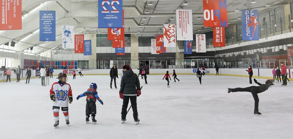 2月9日,孩子們在朝陽大悅城的冰雪運動館體驗和學習滑冰、冰球等冰上運動。新華社記者李欣攝