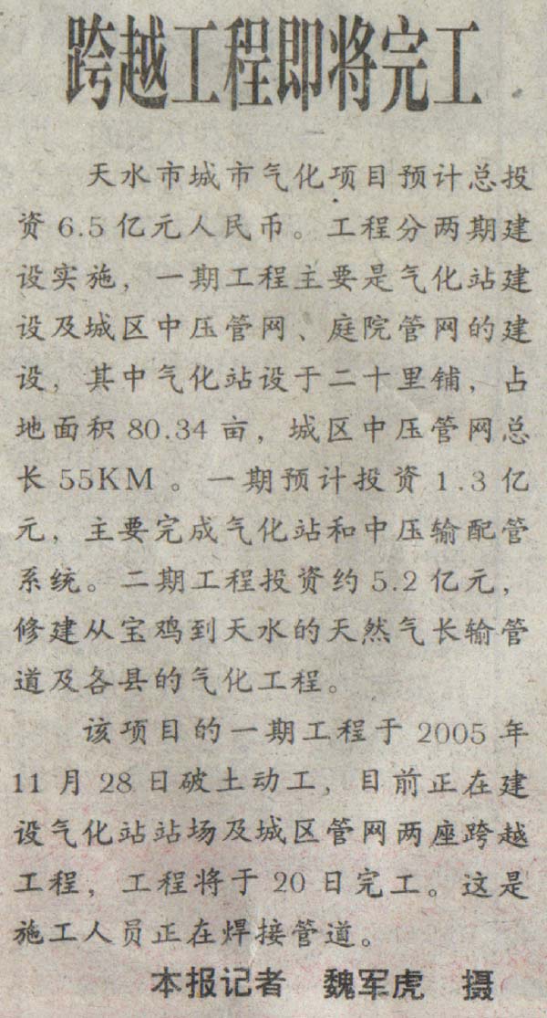 該項目的一期工程于2005年11月28日破土動工,目前正在建設氣化站站場及城區(qū)管網(wǎng)兩座跨越工程,工程將于20日完工。