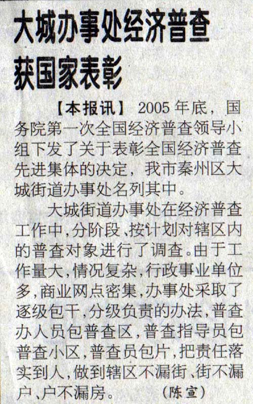 2005年底,國務(wù)院第一次全國經(jīng)濟(jì)普查領(lǐng)導(dǎo)小組下發(fā)了關(guān)于表彰全國經(jīng)濟(jì)普查先進(jìn)集體的決定,我市秦州區(qū)大城街道辦事處名列其中。