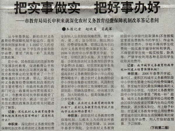 天水市教育局局長申積來就深化農(nóng)村義務教育經(jīng)費保障機制改革答記