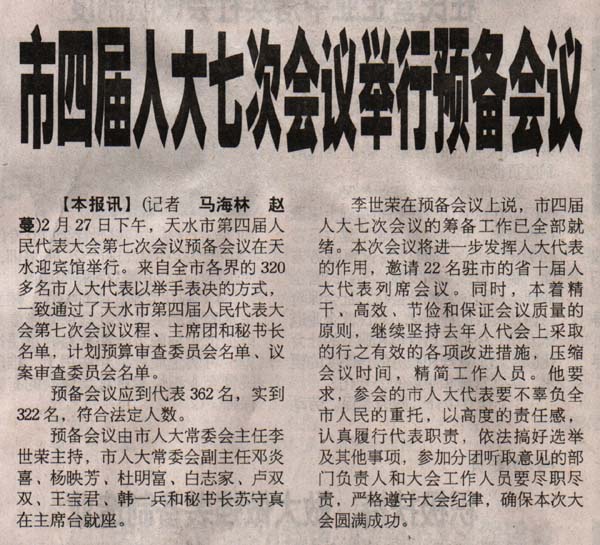【本報(bào)訊】(記者 馬海林 趙蔓)2月27日下午,天水市第四屆人民代表大會(huì)第七次會(huì)議預(yù)備會(huì)議在天水迎賓館舉行。來自全市各界的320多名市人大代表以舉手表決的方式,一致通過了天水市第四屆人民代表大會(huì)第七次會(huì)議議程、主席團(tuán)和秘書長名單,計(jì)劃預(yù)算審查委員會(huì)名單、議案審查委員會(huì)名單。