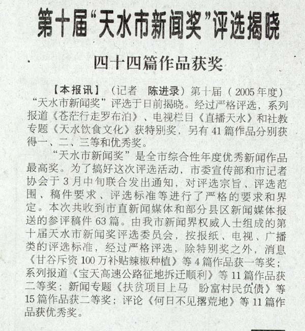“天水市新聞獎”是全市綜合性年度優(yōu)秀新聞作品最高獎。為了搞好這次評選活動,市委宣傳部和市記者協(xié)會于3月中旬聯(lián)合發(fā)出通知,對評選宗旨、評選范圍、稿件要求、評選標(biāo)準(zhǔn)等進(jìn)行了嚴(yán)格的要求和界定。本次共收到市直新聞媒體和部分縣區(qū)新聞媒體報送的參評稿件63篇。由我市新聞界權(quán)威人士組成的第十屆天水市新聞獎評選委員會,按報紙、電視、廣播類的評選標(biāo)準(zhǔn),經(jīng)過嚴(yán)格評選,除特別獎之外,消息《甘谷斥資100萬補貼辣椒種植》等4篇作品獲一等獎;系列報道《寶天高速公路征地拆遷順利》等11篇作品獲二等獎;新聞專題《扶貧項目上馬 盼富村民負(fù)債》等15篇作品獲二等獎;評論《何日不見撂荒地》等11篇作品獲優(yōu)秀獎。