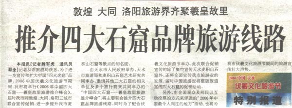 本報訊【記者魏軍虎 通訊員鄢全】記者從市旅游局獲悉,為了進一步宣傳和擴大中國“四大名窟”品牌,2006中國伏羲文化旅游節(jié)期間,我市將舉行《2006年中國四大石窟一一羲皇故里旅游推介峰會》。屆時我市同敦煌、大同、洛陽三城市聯(lián)合宣傳促銷,進一步提升我市麥積山石窟等景點的知名度。