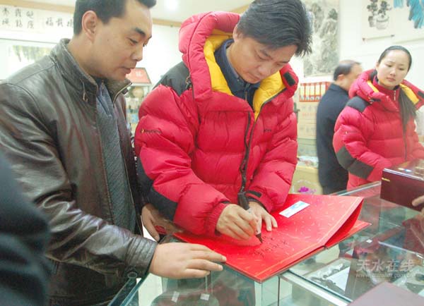 圖為張越正在為天水在線題詞