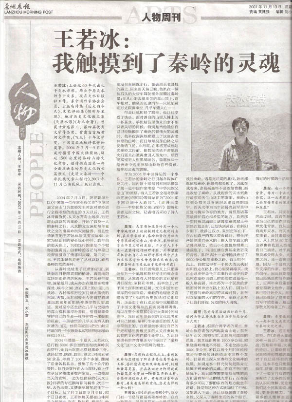 作為2004年中國詩壇的一個(gè)事件,王若冰的秦嶺之行引起各媒體廣泛關(guān)注,國內(nèi)數(shù)十家報(bào)刊和網(wǎng)站播發(fā)了第一位中國作家考察“中華民族父親山”的消息。詩人王若冰全程考察秦嶺還被《詩家園》等網(wǎng)站評(píng)為“2004年中國詩壇十大新聞”!蹲哌M(jìn)大秦嶺———中華民族父親山探行》即將和讀者見面之際,記者電話采訪了詩人王若冰。