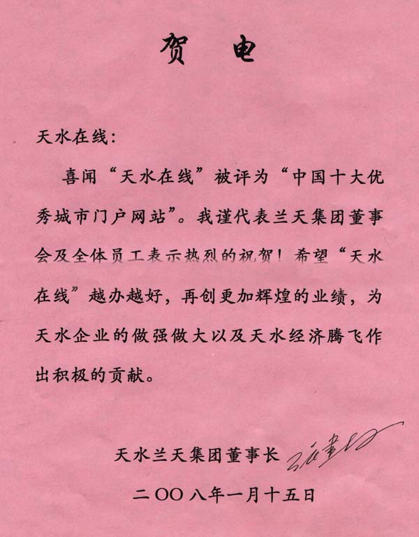 喜聞“天水在線”被評(píng)為“中國(guó)十大優(yōu)秀城市門戶網(wǎng)站”。我謹(jǐn)代表蘭天集團(tuán)董事會(huì)及全體員工表示熱烈祝賀!希望“天水在線”越辦越好,再創(chuàng)更加輝煌的成績(jī),為天水企業(yè)的做強(qiáng)做大以及天水經(jīng)濟(jì)騰飛作出積極的貢獻(xiàn)。