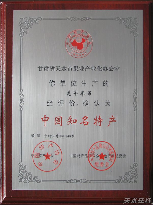 日前,由中國特產(chǎn)協(xié)會、中國食文化研究會等多家單位聯(lián)合并通過中國特產(chǎn)營銷網(wǎng)、中國特產(chǎn)博覽網(wǎng)等數(shù)十家媒體開展的“中國特產(chǎn)品牌公眾評選活動”落下帷幕,天水市果業(yè)產(chǎn)業(yè)化辦公室推選的花牛蘋果,在全國近500種地方特產(chǎn)中,經(jīng)過3個多月網(wǎng)上的激烈角逐,花牛蘋果以10萬余票的高得票率名列評選活動的前茅,榮獲“中國知名特產(chǎn)”稱號。并由中國特產(chǎn)協(xié)會和中國特產(chǎn)品牌公眾評選活動組委會共同頒發(fā)了中國知名特產(chǎn)獎牌及證書。