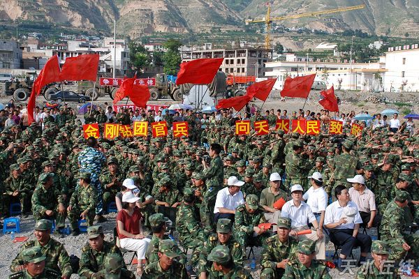 當(dāng)?shù)弥?dāng)?shù)伛v軍子弟兵開赴抗震一線的消息后,市四大組織領(lǐng)導(dǎo)在第一時(shí)間組成慰問團(tuán),冒著余震頻發(fā)、山體滑坡、道路不暢的威脅,連夜趕赴一線慰問。在建軍81周年前夕,市四大組織領(lǐng)導(dǎo)和天水軍分區(qū)、天水預(yù)備役的主要領(lǐng)導(dǎo),率80多人的慰問團(tuán),再次赴前線慰問。在部隊(duì)回撤之時(shí),又舉行了隆重?zé)崃业臍g迎儀式,令我們十分感動(dòng)。
