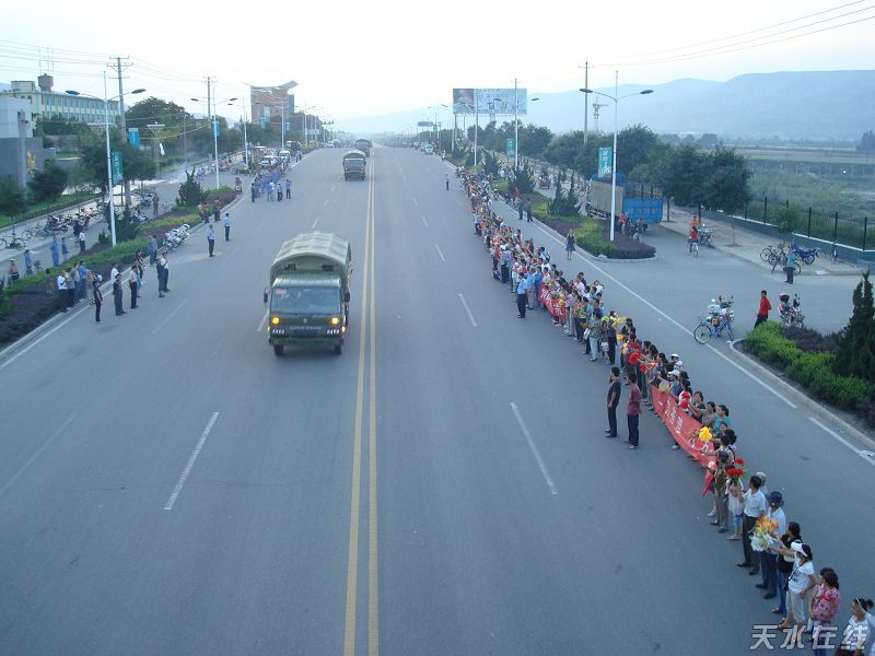 “5·12”汶川特大地震發(fā)生后,駐守在天水的紅軍師子弟兵于5月13日開赴隴南抗震救災(zāi)第一線。在部隊(duì)分兩批班師之際,市委、市人大、市政府、市政協(xié)、天水軍分區(qū)主要領(lǐng)導(dǎo)和全市各族人民群眾舉行了隆重、熱烈的歡迎儀式,像當(dāng)年打勝仗從前線歸來那樣歡迎抗震救災(zāi)官兵回到第二故鄉(xiāng)。我們倍感親切、深受鼓舞。在此,我們向家鄉(xiāng)各級(jí)黨委政府和354萬父老鄉(xiāng)親,表示衷心的感謝和崇高的敬意!