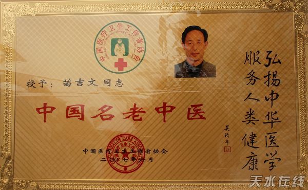 苗吉文業(yè)績1997年被選入<<世界優(yōu)秀醫(yī)學專家人才典>>。1998年選入《世界名人錄》,同年經(jīng)中國保健科學技術學會、中國醫(yī)療保健信息網(wǎng)、國際互聯(lián)網(wǎng)世界名醫(yī)數(shù)據(jù)庫、國際互聯(lián)網(wǎng)全球?qū)めt(yī)問藥站點推薦,獲《國際互聯(lián)網(wǎng)全球?qū)めt(yī)問藥世界名醫(yī)數(shù)據(jù)庫注冊證書》。1999年經(jīng)國家衛(wèi)生部、中華醫(yī)學會、中國醫(yī)學科學院等專家評審選入《中國名醫(yī)一萬家》上卷。同年編入《中華英才大典》、《二十一世紀人才庫》。2000年分別選入《世界科技專家人才》中國醫(yī)學卷、授予“成功中國人”優(yōu)秀人才稱號,業(yè)績登錄“成功中國人”國際互聯(lián)網(wǎng)。業(yè)績?nèi)脒x《世界醫(yī)學界名人錄》網(wǎng)絡版暨被發(fā)布在大型世界杰出醫(yī)學網(wǎng)絡人才庫。入選《1999/2000 ’世紀名醫(yī)風彩》大型紀念冊、并獲1999/2000’ 世紀名醫(yī)稱號、2000年獲世界千年名醫(yī)證書及金質(zhì)胸章一枚、2001年錄入人民畫報社出版的《共和國專家成就博覽》(世紀珍藏版)。慶祝建黨80周年紀念大型書刊《優(yōu)秀共產(chǎn)黨員成就博覽》。2003年編入《東方之子》。2007年榮獲“中國百名創(chuàng)新英才”金像獎。中國醫(yī)療衛(wèi)生工作者協(xié)會中醫(yī)藥專家委員會授予“中國名老中醫(yī)”榮譽稱號、入選中國衛(wèi)生產(chǎn)業(yè)大典和中國特色醫(yī)療精英(珍藏版)。2008年入編《中國?漆t(yī)療機構(gòu)名錄》、《中國中醫(yī)醫(yī)療機構(gòu)全書》和《中國當代醫(yī)療保健精英事跡金典》還分別榮獲:全國中醫(yī)藥繼承與創(chuàng)新獎個人獎和全國中醫(yī)藥行業(yè)最具影響力人物獎。天水苗吉文脊椎病診所榮獲:全國醫(yī)患和諧文明崗稱號。