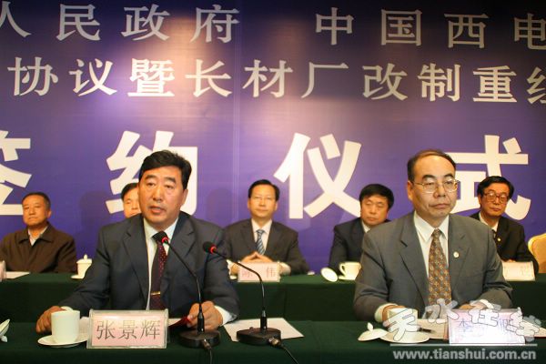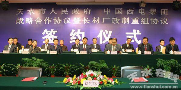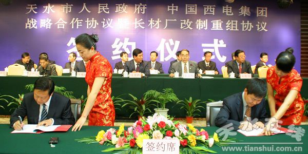 4月30日上午,天水市與中國(guó)西電集團(tuán)在天水賓館隆重舉行戰(zhàn)略合作協(xié)議暨西電集團(tuán)投資重組天水長(zhǎng)城電工器材廠協(xié)議簽約儀式,標(biāo)志著天水在“工業(yè)招商引強(qiáng)”、實(shí)施“工業(yè)強(qiáng)市”戰(zhàn)略方面又取得了一項(xiàng)新的成果,標(biāo)志著天水市和中國(guó)西電集團(tuán)在“關(guān)中——天水經(jīng)濟(jì)區(qū)”裝備制造企業(yè)的聯(lián)合發(fā)展方面邁出了開創(chuàng)性的第一步。