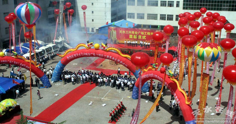 2009年6月22日,原天水飯店舊址建設(shè)工地禮花繽紛,彩旗招展,三興商業(yè)廣場建設(shè)工程舉行奠基典禮。這標(biāo)志著備受全市人民關(guān)注、由天水三興房地產(chǎn)開發(fā)有限公司開發(fā)打造的“甘肅地王”,在我市城市中心區(qū)焦點區(qū)域重新建設(shè)一處極具商業(yè)價值和城市標(biāo)志意義的開發(fā)項目工程正式開工。