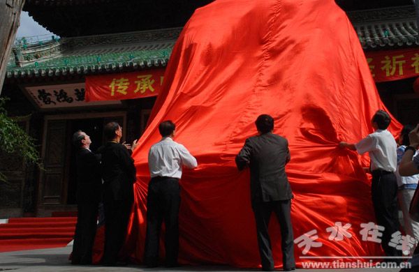市委常委、宣傳部長孫周秦,臺灣伏羲協(xié)會會長張安樂、北大康壽武術(shù)研究中心主任李世信教授、北大康壽武術(shù)研究中心顧問李風(fēng)萍女士、工行天水分行行長楊愛軍、工行隴南分行行長陳衛(wèi)平共同為伏羲女媧圣像揭彩。