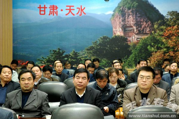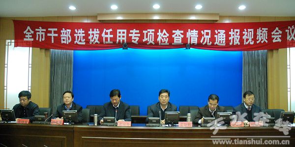 11月12日,在收聽收看了全省干部選撥任用專項(xiàng)檢查情況視頻會(huì)議后,天水市召開全市干部選撥任用專項(xiàng)檢查情況視頻會(huì)議,天水市委書記、市人大常委會(huì)主任張景輝,市委副書記張應(yīng)華,市委常委、常務(wù)副市長(zhǎng)柴金祥,市委常委、紀(jì)委書記楊維俊,市委常委、組織部長(zhǎng)楊繼軍,市委常委、市委秘書長(zhǎng)蔣曉強(qiáng)出席會(huì)議。市長(zhǎng)助理、市政府秘書長(zhǎng)安永,市紀(jì)委、市委組織部班子成員,市直相關(guān)部門負(fù)責(zé)人收聽收看了全省視頻會(huì)議,參加了全市視頻會(huì)議?h區(qū)黨委常委、紀(jì)委和組織部班子成員在各縣區(qū)分會(huì)場(chǎng)收聽收看了視頻會(huì)議。