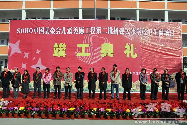 12月8日下午,SOHO中國基金會兒童美德工程第二批捐建天水學校衛(wèi)生間項目竣工典禮在秦州區(qū)興隆學校隆重舉行。SOHO中國董事長潘石屹,箭牌衛(wèi)浴事業(yè)部總經(jīng)理方春,天水市委常委、副市長郭奇若,市委常委、秦州區(qū)委書記張明泰,天水市政府副秘書長雷天錄,天水市教育局局長李淳,秦州區(qū)區(qū)長周偉等市區(qū)領導出席了竣工儀式。