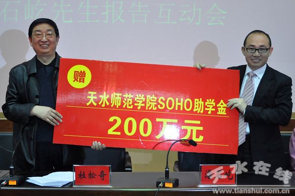12月8日晚,天水師范學(xué)院“SOHO助學(xué)金”頒發(fā)儀式暨潘石屹先生報(bào)告互動會在天水師范學(xué)院第二報(bào)告廳舉行,SOHO中國董事長潘石屹,天水師范學(xué)院黨委書記杜松奇,天水市教育局局長李淳等出席。