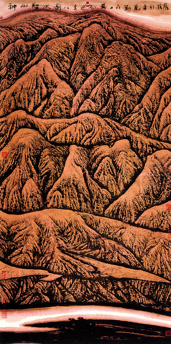 他幾乎像一頭被自己關(guān)在籠子里的獅子,沉溺在斗室里整天琢磨著、實(shí)踐著,畫過的廢紙像雪片隨著歲月飛逝了。痛苦過也興奮過,懷疑過也堅(jiān)定過!皩W(xué)而后困”,“困而后學(xué)”反反復(fù)復(fù),不記晨昏,不避寒暑,把歲月關(guān)在門外,把身心沉浸在一張張宣紙上。有一次他對(duì)我說,除了便溺,他幾乎嘗遍了一切可以嘗的介質(zhì)。正如劉國(guó)松先生所記:“為了使畫面有厚、重、濁、散的感覺,他還用過糨糊,甚至牛奶、汽油、松節(jié)油、牛膠等,都達(dá)不到預(yù)期的效果。最后他發(fā)現(xiàn)了一種特殊材料,這種材料可以使墨色有堆起的厚重感。經(jīng)過8年不停地試驗(yàn)和探索,那道通往西藏山水畫的暗門終于被劉萬年找到并敲開了!