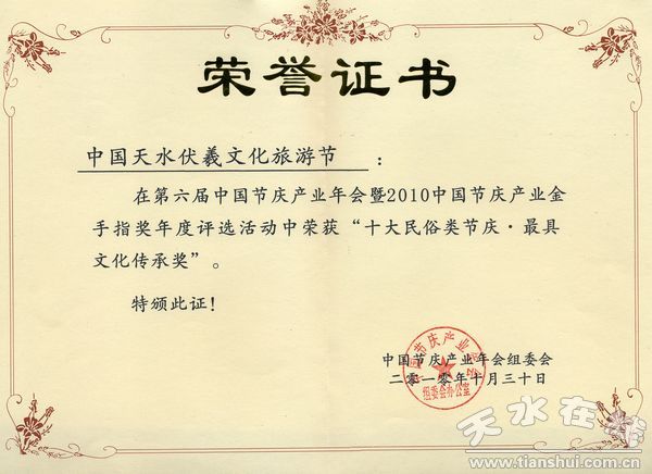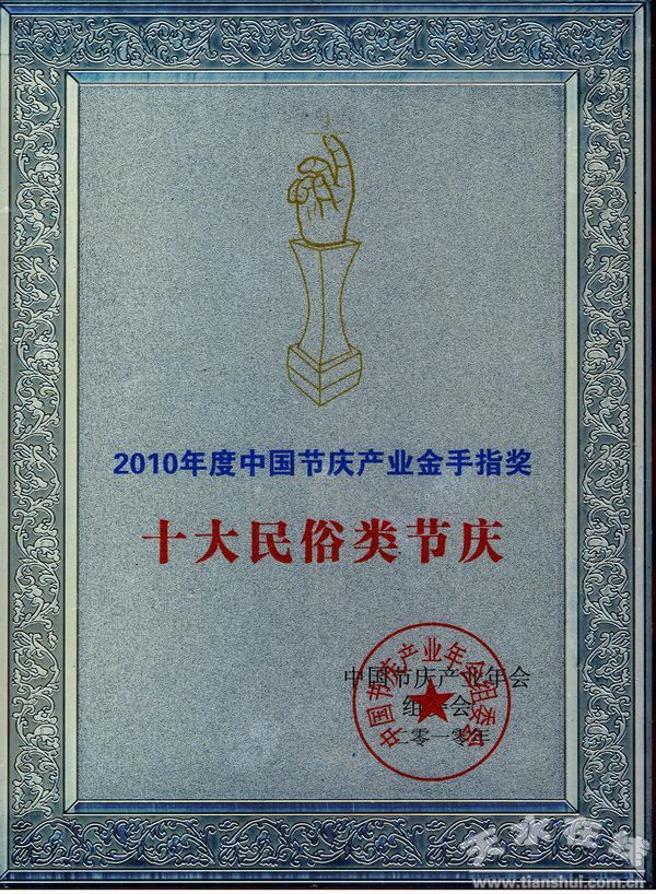 這次年會是由中國城市經(jīng)濟學(xué)會、新華網(wǎng)、亞洲財富論壇、中國節(jié)慶產(chǎn)業(yè)年會組委會聯(lián)合主辦的。本年度中國節(jié)慶產(chǎn)業(yè)獎評選堅持以公正性、宏觀性和權(quán)威性的原則,采取專業(yè)機構(gòu)推薦候選名單,通過網(wǎng)上投票,專家打分和新聞媒體指數(shù)檢索相結(jié)合的方式(由主辦單位負責組織,不收取任何申報費用),評選出2010年度中國十大品牌節(jié)慶,十大民俗類節(jié)慶和十大節(jié)慶新聞人物等獎項,最后由中國節(jié)慶產(chǎn)業(yè)年會專家委員會審定,確認獲獎結(jié)果。這次獲獎,是對天水節(jié)慶活動的又一次肯定和認可,對更好的宣傳伏羲文化,提升天水知名度,擴大伏羲文化旅游節(jié)在國內(nèi)外的影響力,加強對外合作交流將產(chǎn)生重要影響。