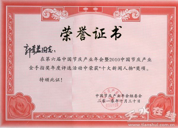 金秋十月,碩果豐盈。在舉世矚目的2010年上海世博會圓滿落幕之際,第六屆中國產(chǎn)業(yè)年會暨2010年中國節(jié)慶金手指獎頒獎盛典10月31日在滬落下帷幕。天水伏羲文化旅游節(jié)榮膺“2010中國節(jié)慶產(chǎn)業(yè)金手指獎•十大民俗類節(jié)慶•最具文化傳承獎”,天水市委常委、副市長郭奇若榮獲“2010中國節(jié)慶產(chǎn)業(yè)金手指獎•十大新聞人物”獎。