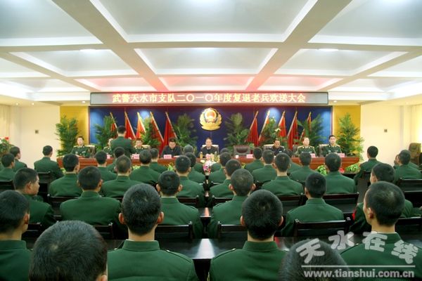 11月25日上午,武警天水支隊(duì)在五樓會議室隆重舉行2010年度退伍老兵歡送大會。市委常委、政法委書記韓岱成出席歡送會并做了重要講話。